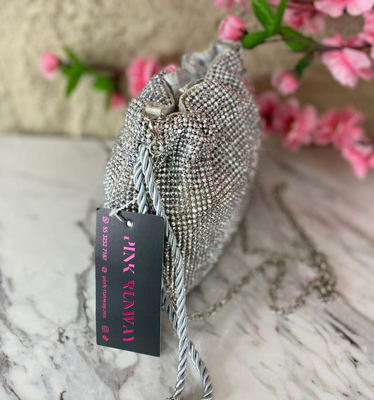BOLSO CON BRILLOS Y CINTAS PLATA