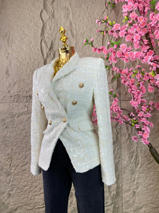 BLAZER CON LENTEJUELA Y BOTONES DORADOS BLANCO NACAR
