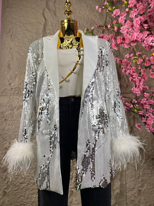 BLAZER LARGO DE LENTEJUELAS Y PLUMAS PLATA
