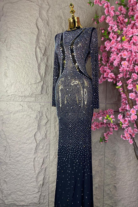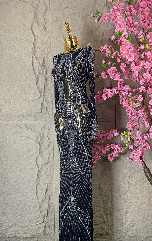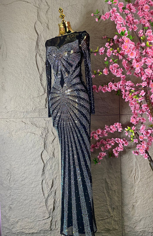 VESTIDO LARGO ML CON CRISTALES Y FONDO NEGRO