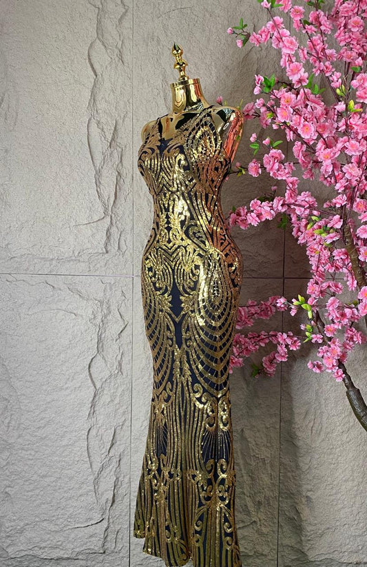 VESTIDO LARGO CON LENTEJUELA DORADA NEGRO