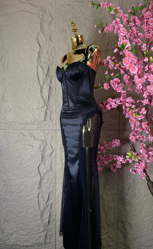 VESTIDO LARGO CON TRANSPARENCIAS Y SATIN NEGRO