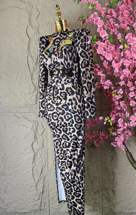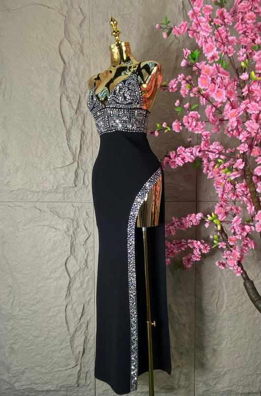 VESTIDO LARGO CON ABERTURA AL FRENTE CON CRISTALES NEGRO