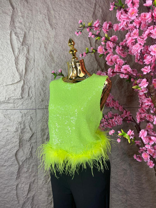 BLUSA CON LENTEJUELA Y PLUMAS VERDE LIMON
