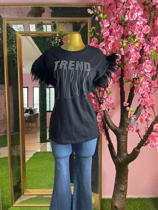 PLAYERA TEE SM CON PLUMAS Y BRILLOS NEGRO