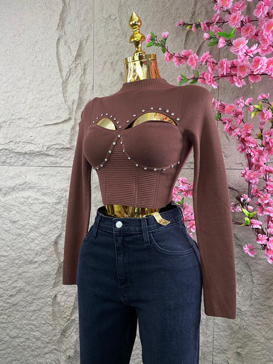 BLUSA TOP CON ESCOTE Y BROQUELES CAFE