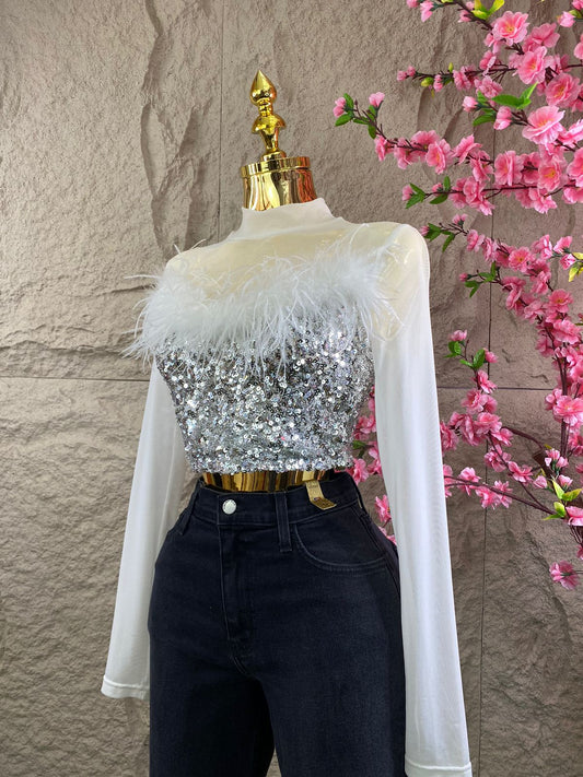 BLUSA ML LENTEJUELA Y PLUMAS BLANCO/PLATA