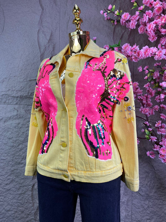 CHAMARRA AMARILLA FLOR ROSA