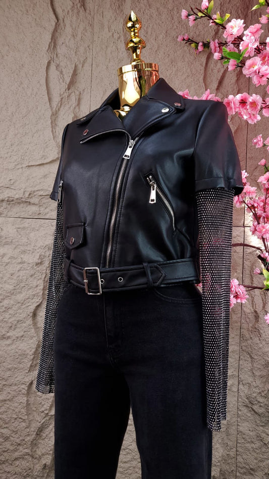 CHAMARRA VINIPIEL CON MANGAS DE RED NEGRA
