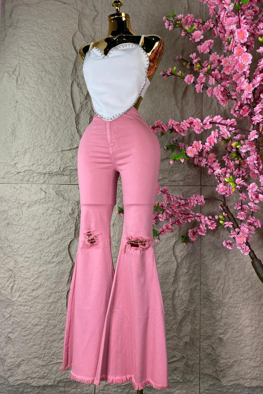 PANTALON CAMPANA DESGARRE MEZCLILLA ROSA