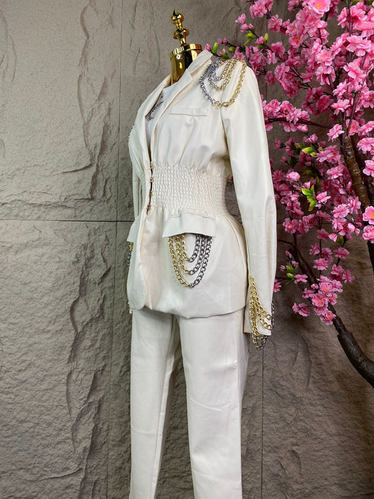 CONJUNTO SACO/ PANTALON EN VINIPIEL CON CADENAS BEIGE