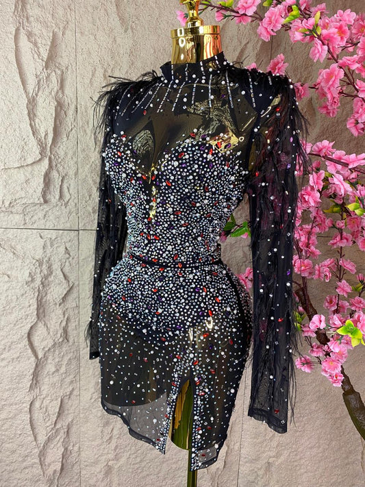 • SET DE FALDA /BLUSA ML CON CRISTALES COLORES  Y PLUMAS