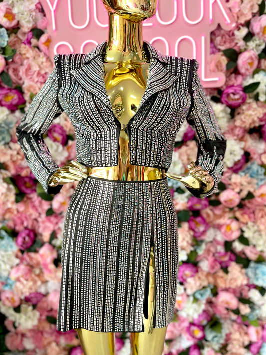 • CONJUNTO SACO/FALDA CON ABERTURA AL FRENTE CON CRISTALES NEGRO