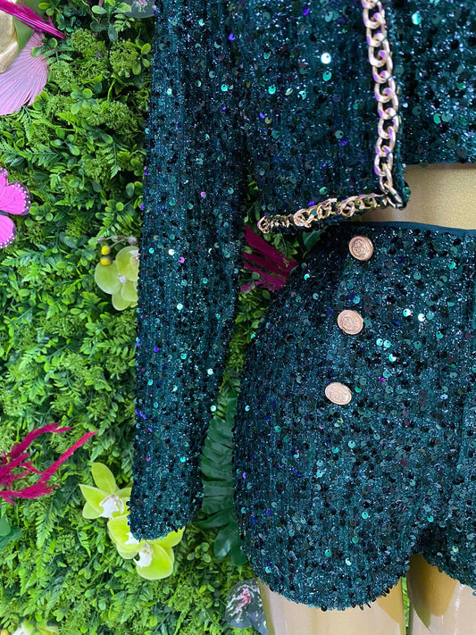 CONJUNTO SHORT/TOP/SACO LENTEJUELA VERDE