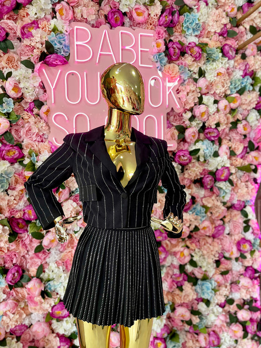 CONJUNTO SACO/ FALDA SHORT CON LINEAS BRILLOSAS NEGRO