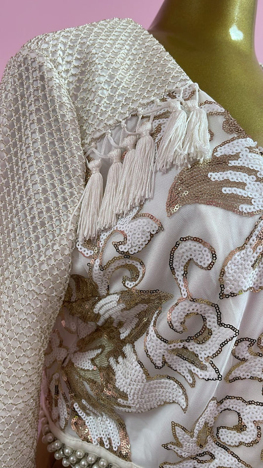 Sold outSACO CORTO LENTEJUELA Y FLECOS BEIGE