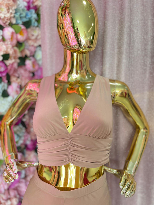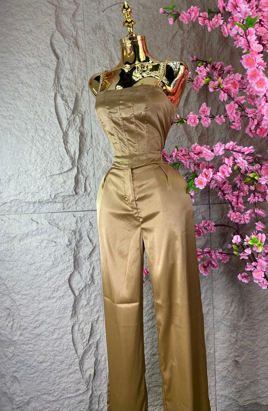 SET DE TOP/PANTALON SATINADO BRILLOSO CAFÉ