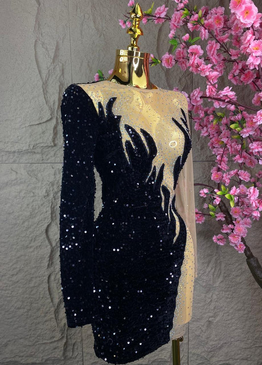 VESTIDO CORTO DRAPEADO ML CON BRILLOS NEGRO