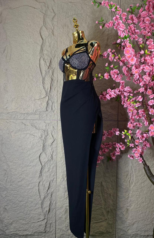 CONJUNTO TOP/FALTA DRAPEADO CON PIEDRAS NEGRO