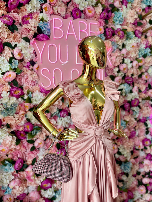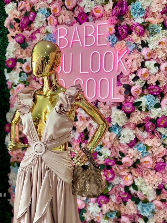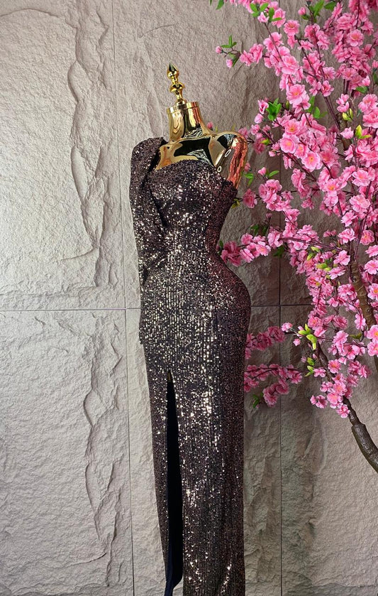 VESTIDO LARGO A UN HOMBRO LENTEJUELA COBRE