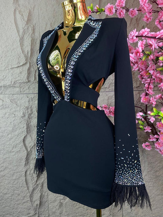 VESTIDO CON ESCOTE EN CADERA CON CRISTALES Y PLUMAS