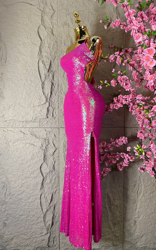 VESTIDO LARGO TIRANTES CON ABERTURA AL FRENTE LENTEJUELA ROSA