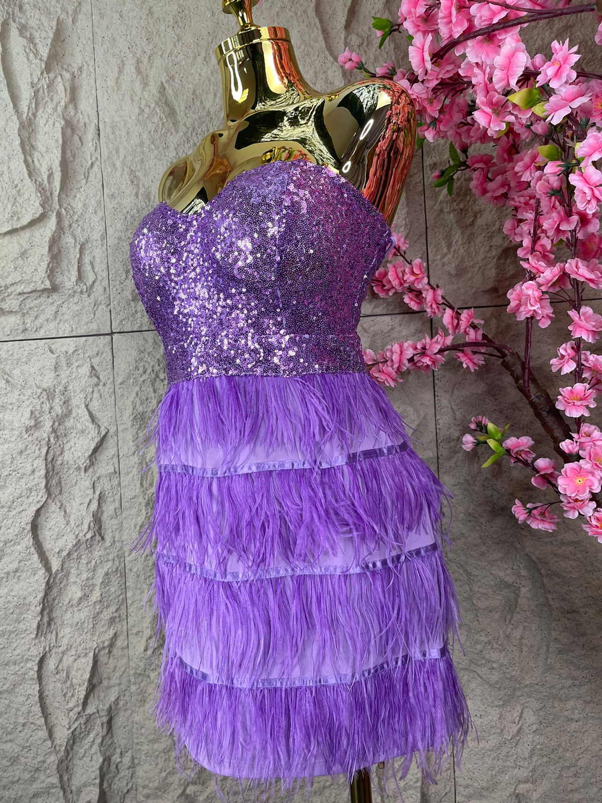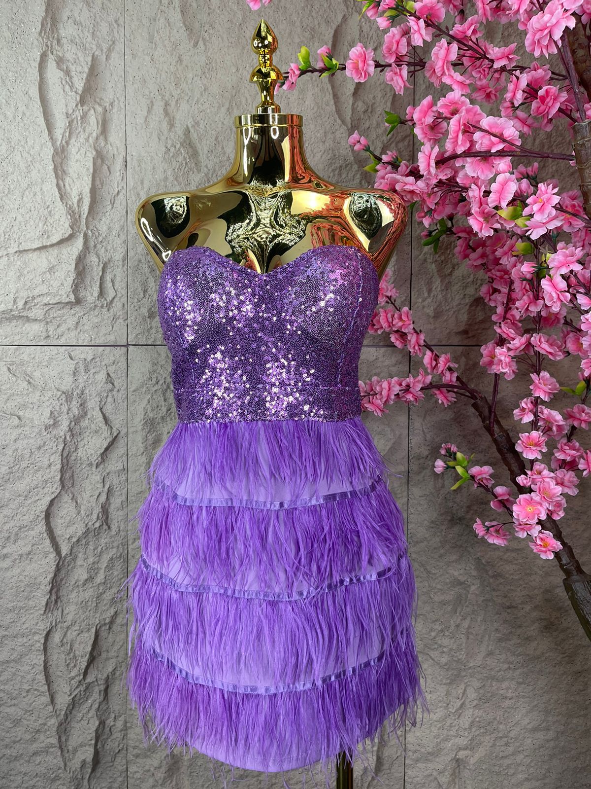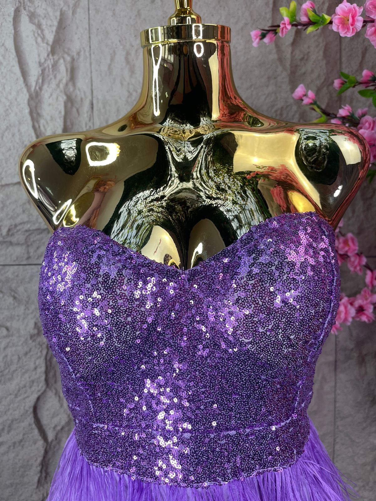 Vestido strapless en corte corazón con lentejuela en parte superior, plumas en falda y espalda ajustable color blanco/morado.